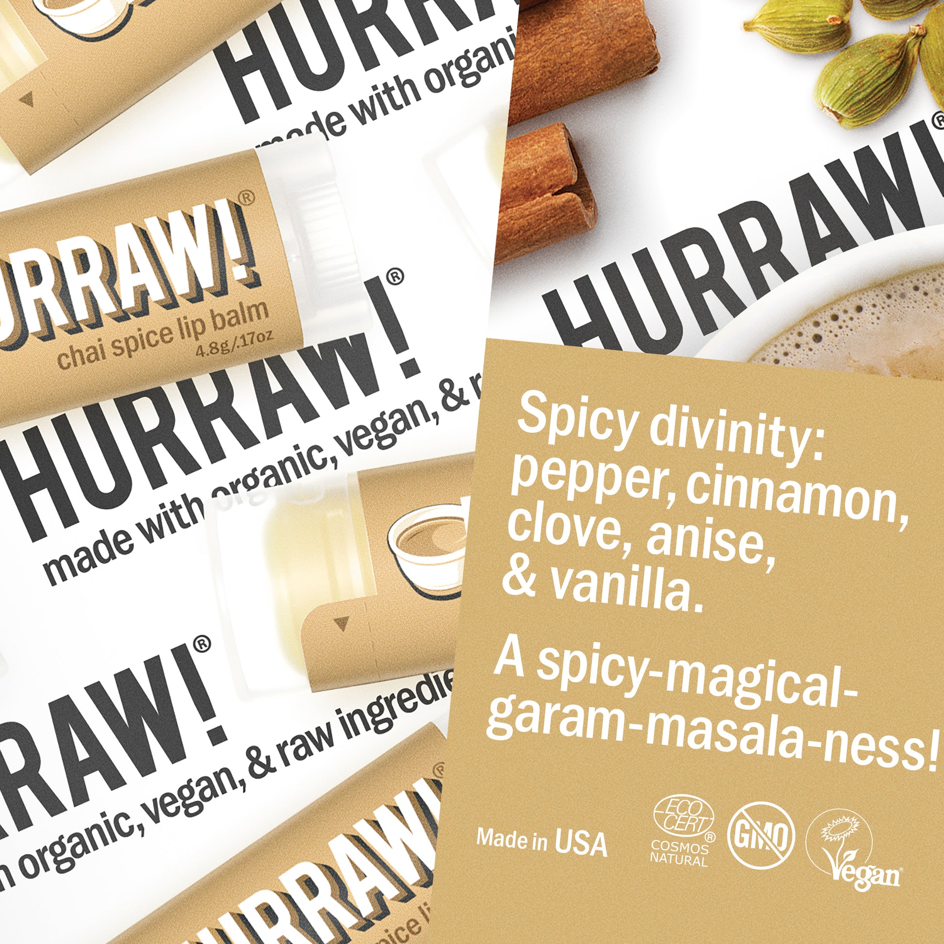 Now we can get our chai on all day. It's the real deal; a blend of black pepper, cinnamon, clove, anise, and vanilla. Spicy divinity!